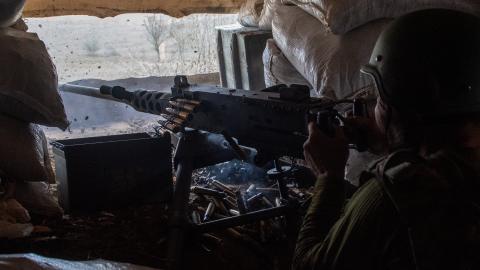A Ukrainian soldier practices using a machine gun during shooting and tactical drills in Ukraine on November 10, 2025. (Getty Images)