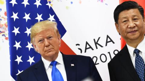 Chinese soldiers march with the national flag (C), flanked by the flags of the Communist Party of China (R) and the People's Liberation Army (L) during a military parade at Tiananmen Square