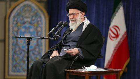 Two Islamic Revolutionary Guard Corps armed military personnel are monitoring an area while standing guard next to an Iranian Majid anti-aircraft missile system during the Ela Beit Al-Moghaddas military rally in Tehran, Iran, on November 24, 2023. (Morteza Nikoubazl/NurPhoto via Getty Images)